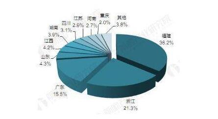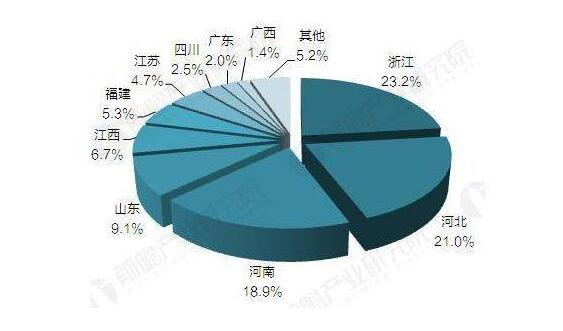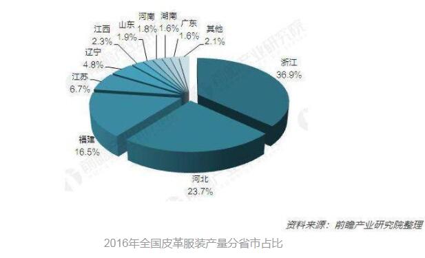 從產品用途來看,中國皮革產品用于皮鞋和服飾為主,分別占到35%和20%,超過一半的皮革制品用于這兩類成品。如下圖所示浙江省在皮鞋產量中位居第二,在服飾產量中位居第一。2015年,全國規模以上皮革行業共有8114家企業,浙江省也以1728家的數量位居第一。