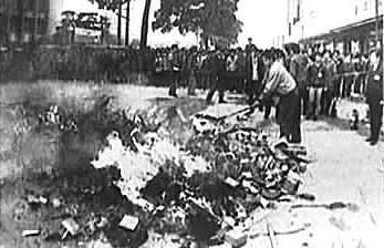 1987年8月8日,杭州武林門廣場前被查抄的偽劣溫州鞋堆積成一座小山,憤怒的杭州人點起大火,將5000多雙皮鞋付之一炬,沖天的煙霧和刺鼻的氣味籠罩在廣場上空久久未散去。