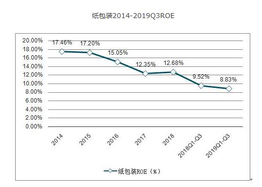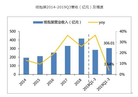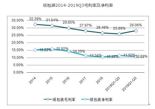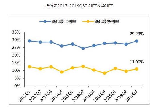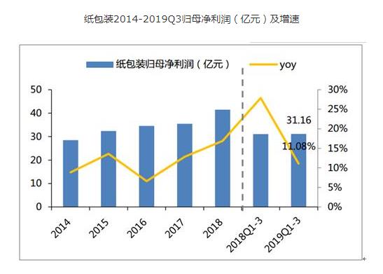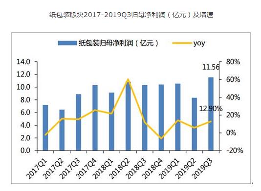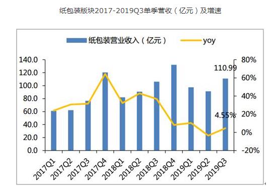 2019Q1-3紙包裝板塊實現營業收入306.01億元,同比+3.64%;實現歸母凈利潤31.16億元,同比+11.08%。