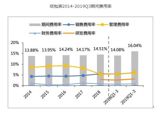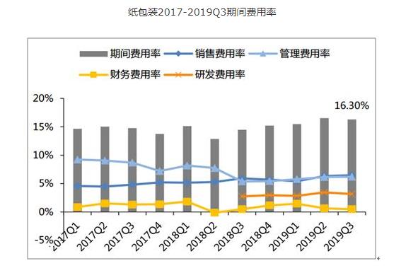 2019Q1-3紙包裝子版塊毛利率同比+2.17pcpts至28.06%,凈利率同比-0.80pcpts至10.69%。期間費用率同比+1.95pcpts至16.04%,其中銷售費用率同比+0.62pcpts至6.06%;管理費用率同比+0.64pcpts至5.99%;財務費用率同比+0.17pcpts至0.84pcpts;研發費用率同比+0.52pcpts至3.14%。
