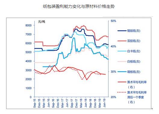 盈利能力改善系:1)原材料價格回落:2018Q2各紙種價格較高,2019Q2各紙種價格明顯同比回落(銅版紙、雙膠紙、白卡紙、白板紙、箱板紙同比下降19%、14%、13%、12%和20%),考慮到原材料庫存周期,2019Q3行業盈利能力有望繼續環比提升。2)行業整合話語權提升:紙包裝行業持續整合,如箱板瓦楞紙龍頭合興包裝訂單量逆勢持續增長,行業整合推動行業盈利水平觸底回升。3)提升價值鏈附加:以紙包裝為載體為品牌商提供高附加值服務,提升整體毛利率,例如吉宏股份以包裝為載體,跨界拓展精準營銷與跨境電商,實現線上廣告和線下包裝業務的深度融合。