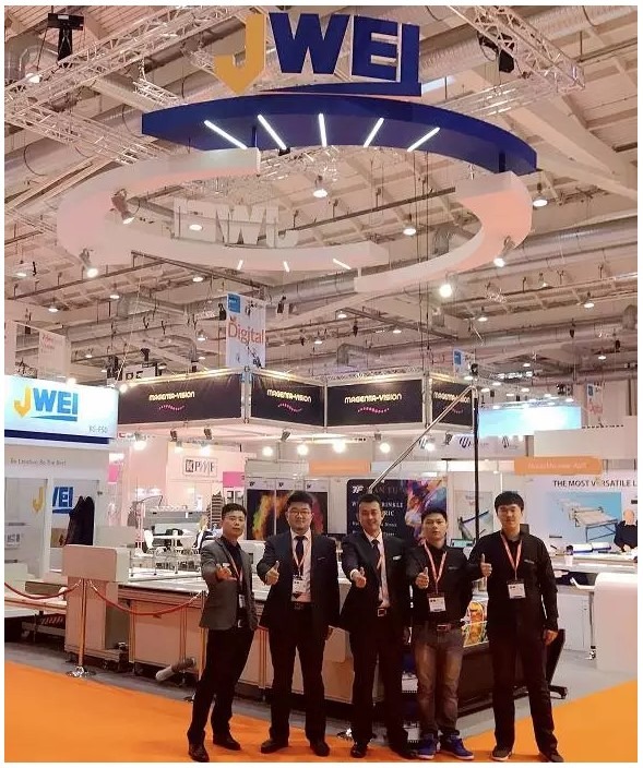 分享會上特別說到一位叫Mark的客戶,數年前科隆FESPA展會就已相識,之后在阿姆斯特丹,在拉斯維加斯等多地多個展會,都有見過面,客戶一直在關注經緯設備。今年在漢堡,Mark又來到經緯展臺,對Frank說(全程英文交流),大概意思是你們這次展會設計很漂亮,設備做得也越來越精致了。在新款CB03II設備旁,Mark邊看他手機屏幕邊對比眼前的設備,說起了一個秘密,他手機里有一個匈牙利朋友發給他的一張設備照片,是一款去年年底新購的CB03II型經緯設備,可以自動送料,自動調用切割文件,自動切割材料,自動收料,操作